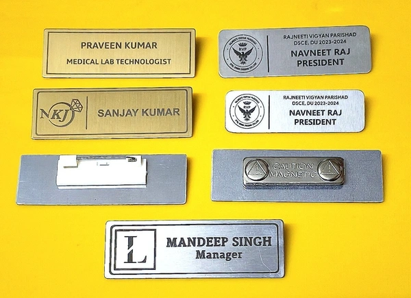 If you are a business organization, school or college and require new badges on a regular basis, you can easily order online, or contact us directly and we can save your name badge LOGO design file in our records. A wide range of badges are manufactured at our factory in New Delhi and we provide delivery anywhere in India on all orders. Order your name or logo badges with any backing you like. Choose the style of badge that suits your needs - with pin or magnet, laser engraved print or multicolour print.